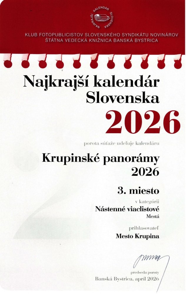 Kalendár mesta Krupina na rok 2026 s názvom Krupinské panorámy v 34. ročníku celoslovenskej súťaže NAJKRAJŠÍ KALENDÁR SLOVENSKA v kategórii MESTÁ sa umiestnil na 3. mieste. Súťaž organizuje Prezídium menované Klubom fotopublicistov Slovenského syndikátu novinárov s hlavným spoluorganizátorom Štátnou vedeckou knižnicou v Banskej Bystrici.