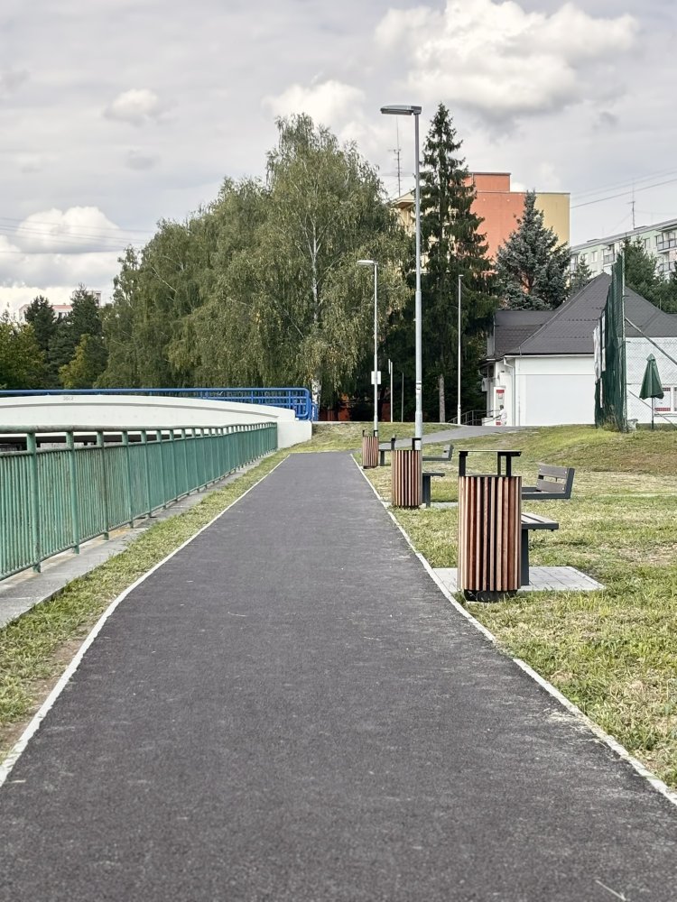 Nový chodník s kvalitným asfaltovým povrchom bol navrhnutý tak, aby poskytol pohodlný priestor pre peších, rodičov s kočíkmi aj starších občanov. Súčasťou realizácie bolo aj osadenie moderného mestského mobiliáru – nových lavičiek a odpadkových košov, ktoré spríjemnia čas každému, kto sa rozhodne na chvíľu zastaviť a oddýchnuť si.