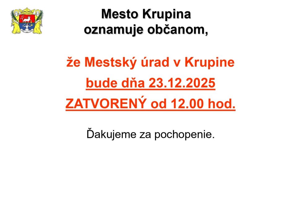 Mestský úrad 23. decembra 2025 (utorok) ZATVORENÝ od 12.00 hod.
