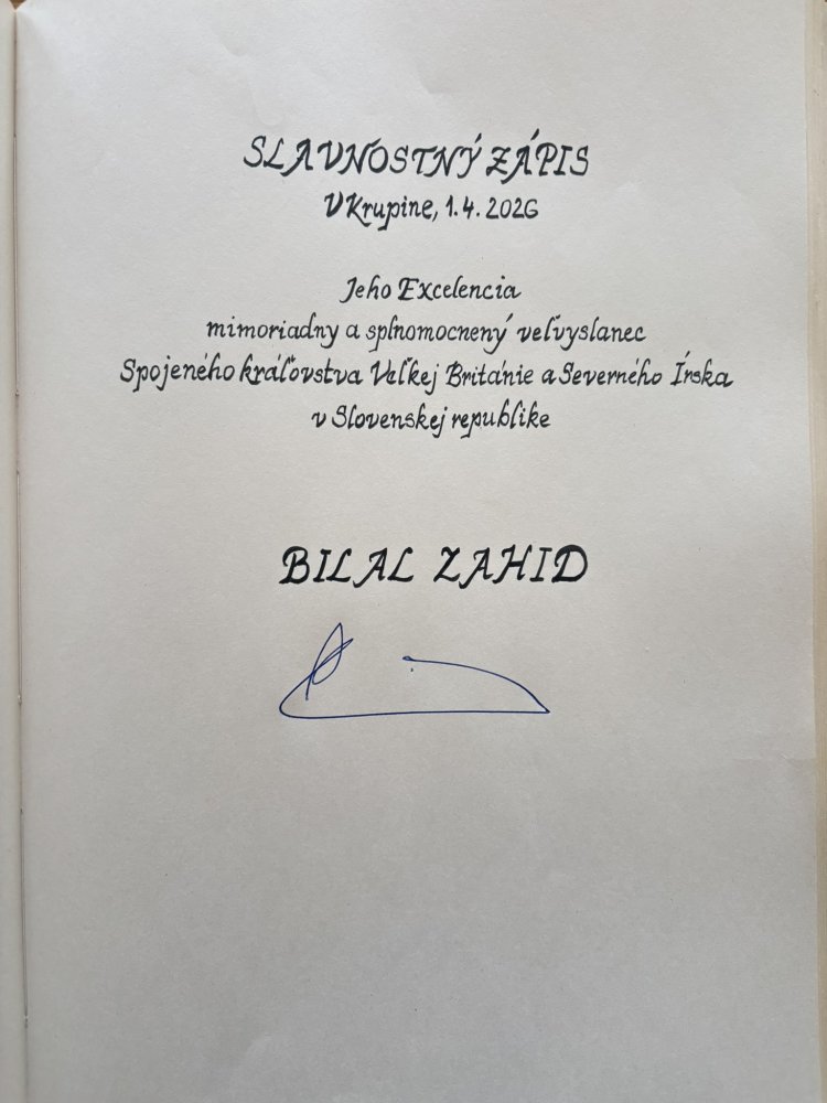 Dňa 1. apríla 2026 navštívil mesto Krupina Jeho Excelencia mimoriadny a splnomocnený veľvyslanec Spojeného kráľovstva Veľkej Británie a Severného Írska v Slovenskej republike, pán Bilal Zahid.